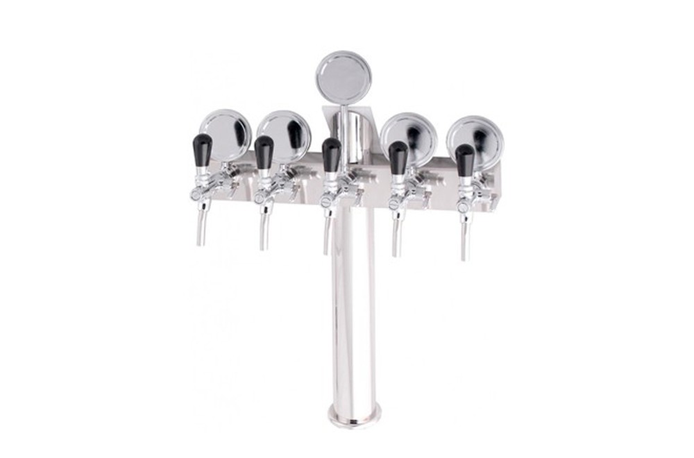 5-way T-shaped font for tapping water, beer, wine, equipped with 5/8 threading taps and badge holders.